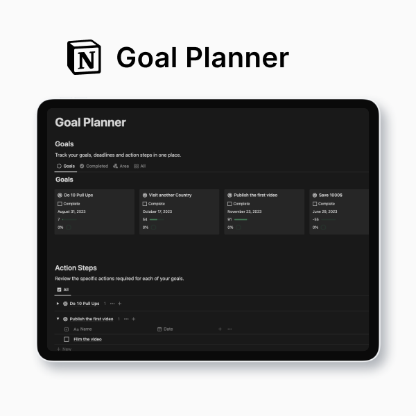 Introducing my Notion Goal Planner Template – the ultimate tool to help you chart your course to success effortlessly. This template is not only a powerful resource but is also completely free to use within Notion.